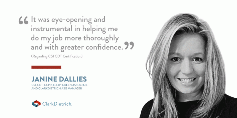 Registration is currently open for the Spring 2019 CDT Exam. To inspire and encourage anyone thinking of taking this next step in their career, we recently caught up with our own Janine Dallies, CSI, CDT, CCPR, LEED Green Associate, ASG Manager, who has not only benefited from the designation herself, but has extensive experience helping other professionals navigate the certification process.