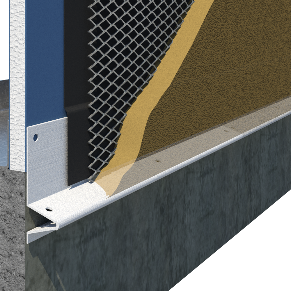 Designed to direct moisture from stucco and to act as a stop. Install on frame construction where stucco and foundation walls meet.
