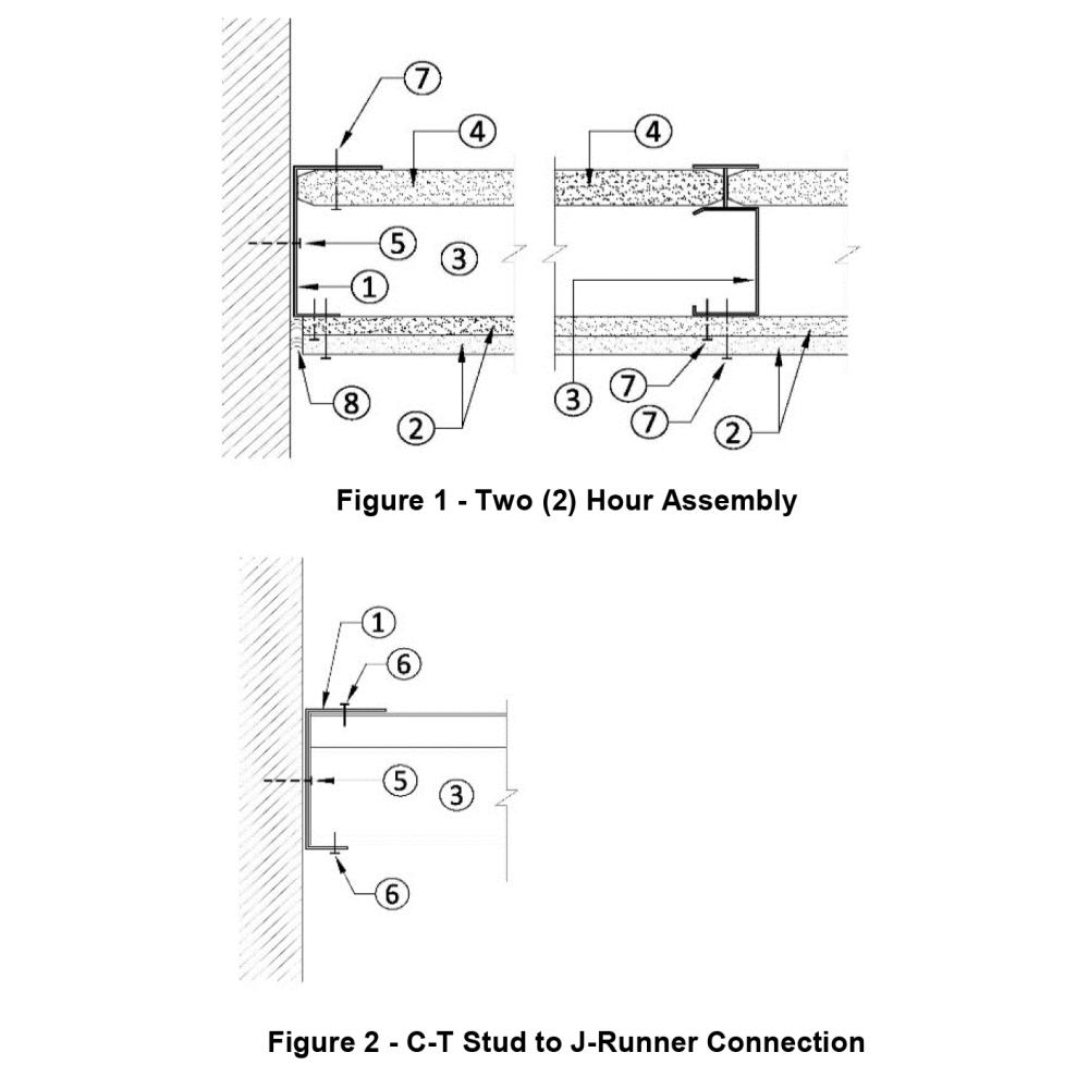 43mil, 0.0451-in (18ga) thickness for 18ga C-T studs. (Item ③) - The J-Track (Item ①) is positioned with the shorter 1-in long leg of the track facing the floor.