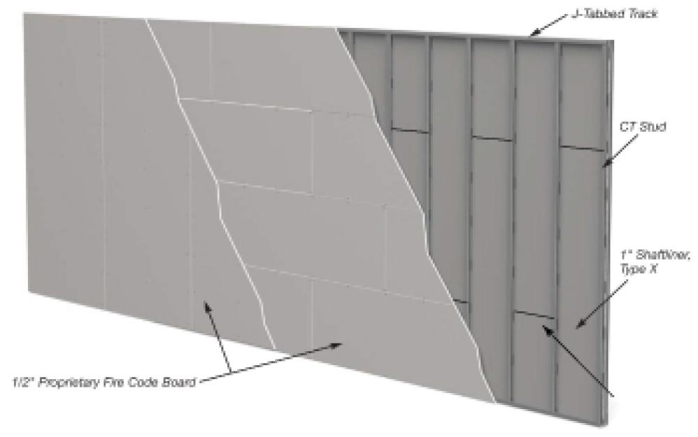 Shaftwall System consists of 1" shaftliner panels supported by 2-1/2", 4" or 6" C-T Studs and faced on one side with two layers of 1/2" fire code board.