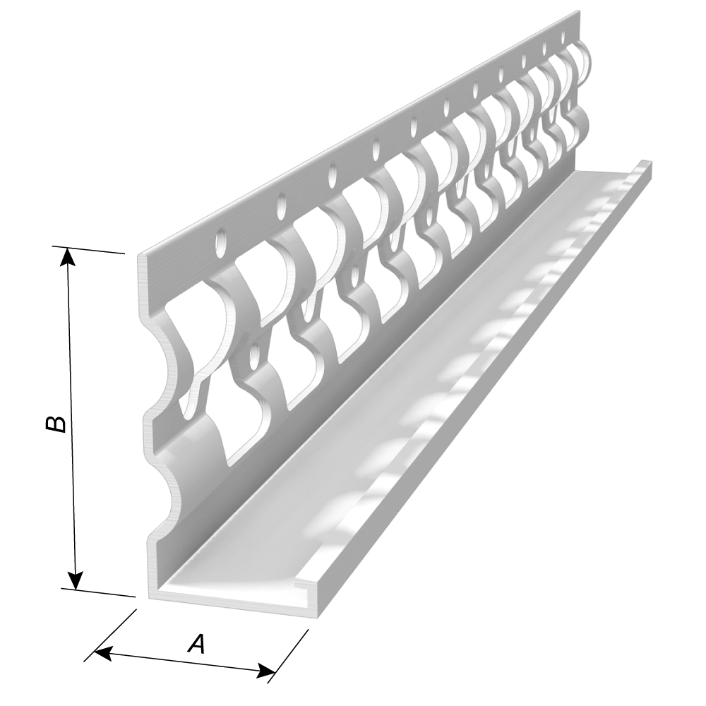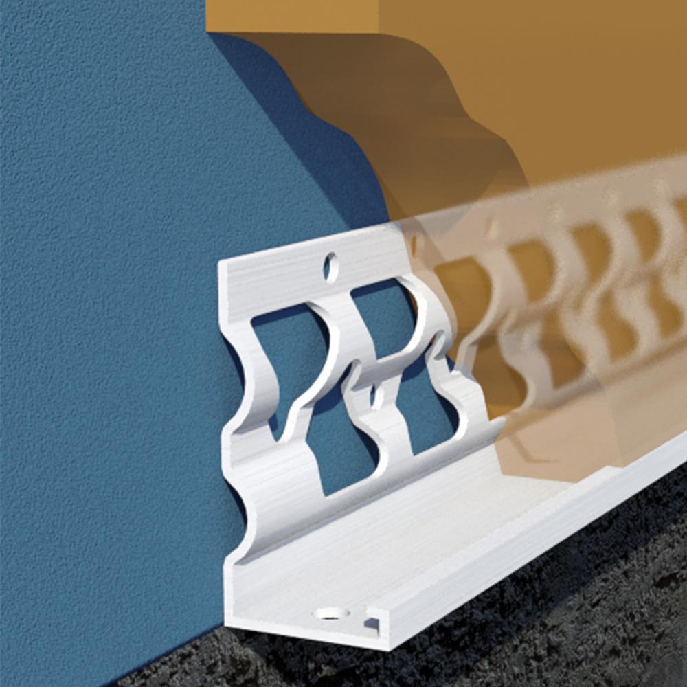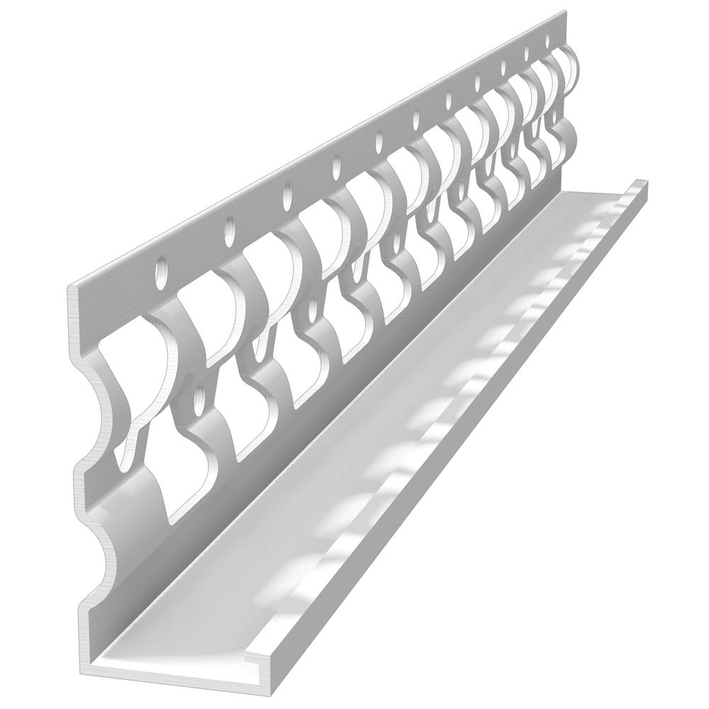 The E-Flange profile provides 80% more stucco embedment than traditional flat flange profiles. E-Flange allows for more stucco mix to flow through the flange, providing for more thorough and consistent embedment. The unique E-Flange shape also allows for quick and easy tying of lath and other accessories.