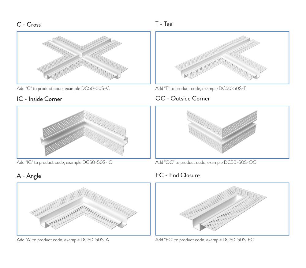 It is recommended that additional 10ft. channel reveal material is ordered along with all intersections to ensure seamless connections. Caulk all intersections, butt joints, ends and corners at time of installation.